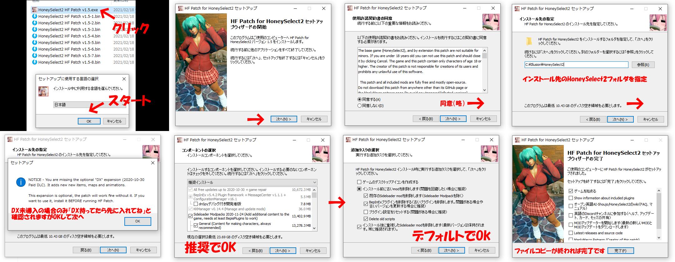 1. DL保存先にHoneySelect2 HF Patch v1.5.exeとHoneySelect2 HF Patch v1.5-1.binからv1.5-8.bin.までの8つのファイルがあることを確認したら、HoneySelect2 HF Patch v1.5.exeをクリックしウイザードにそってインスコ開始。例はv1.5ですが最新版も基本同じです。Steam版はHF Patch v2.0以降で対応済み(国内版は\LLUSION\HoneySelect2フォルダ、Steam版は\Steam\SteamApps\common\HoneySelect2フォルダを指定すること。)